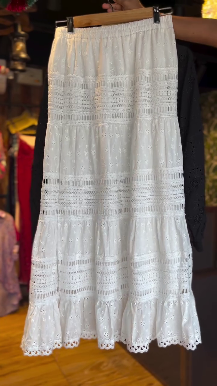 Be the first to review “Black Floral Embroidered Sheer Long Sleeve Crop Top Paired with White High-Waisted Tiered Cotton Skirt Featuring Intricate Lace Cutwork and Eyelet Detailing – Perfect for Chic Daywear or Casual Outings” Cancel reply