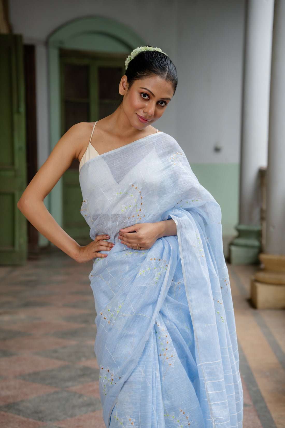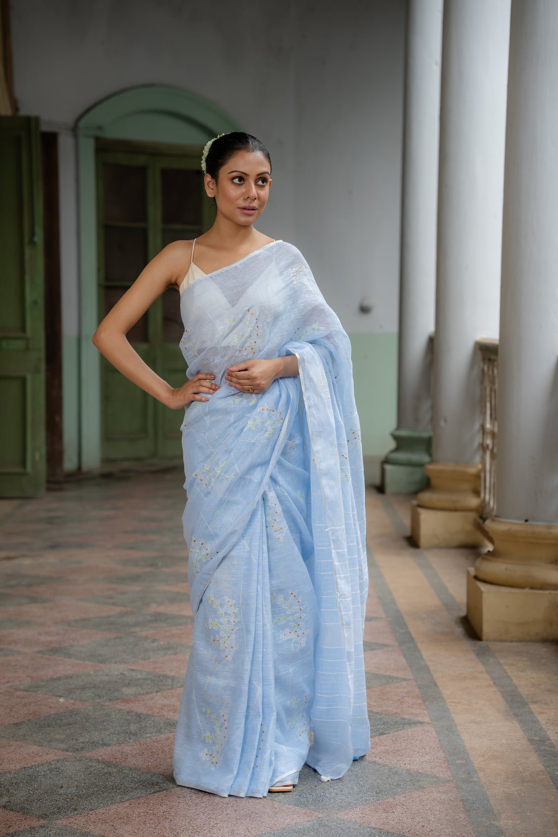 Celestial Beauty Powder Blue Embroidered Linen Sari