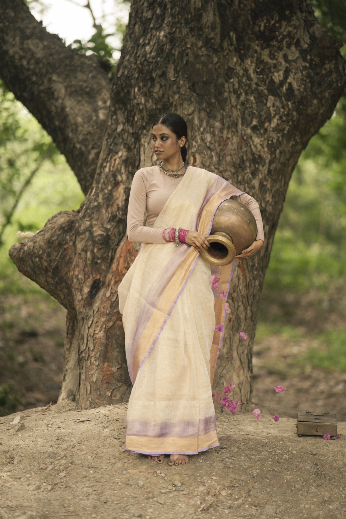 Chakori Beige & Lavender Tie Dye Tissue Linen Sari