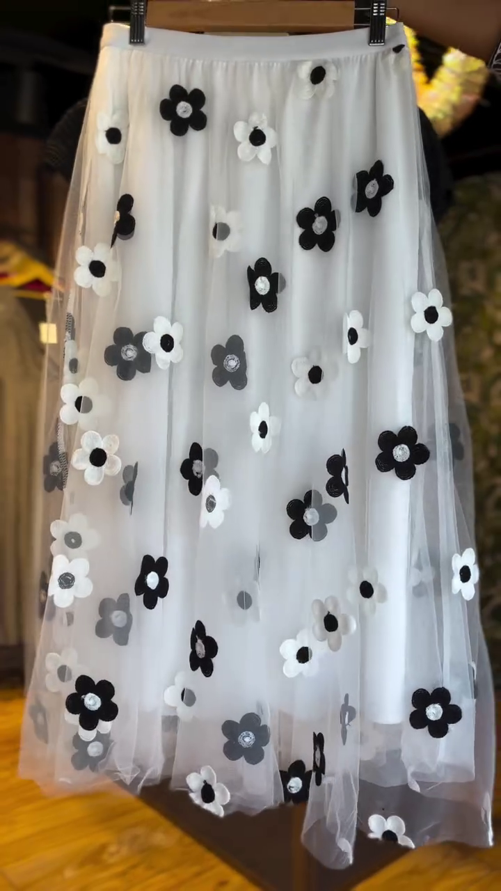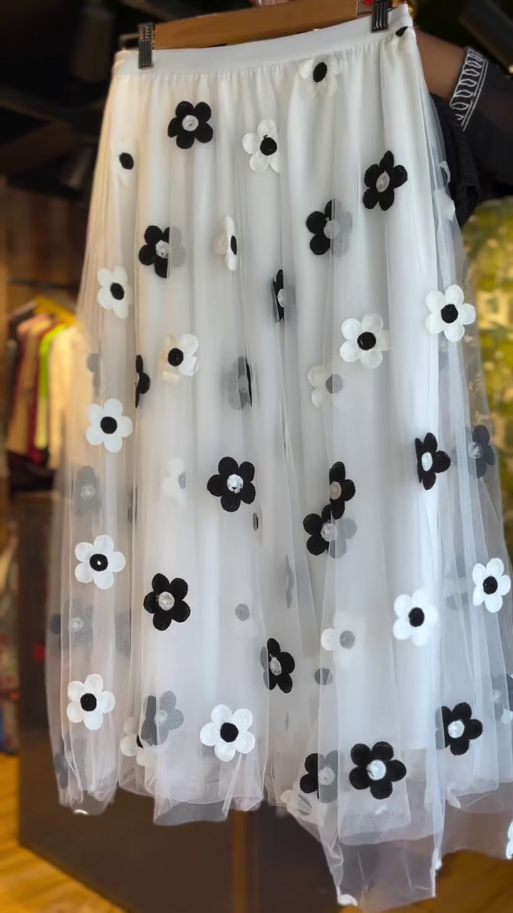 Detailed floral appliqué in contrasting black and white embellishes the skirt, offering a unique and tactile decorative element that stands out. -