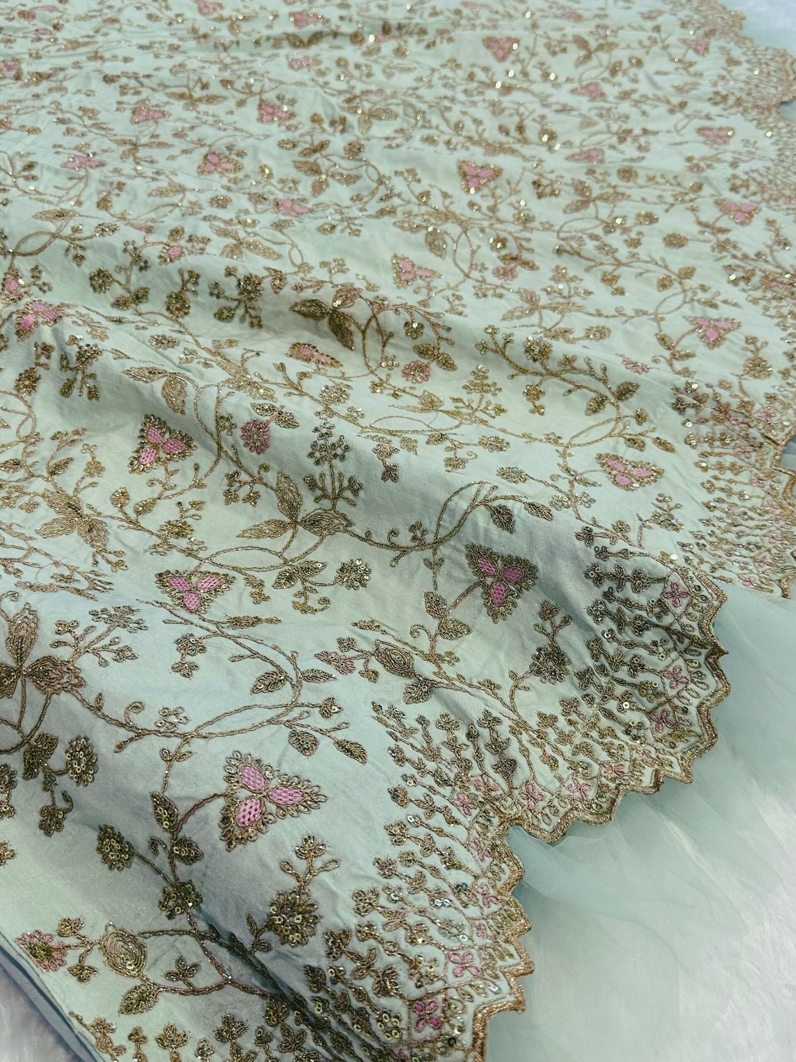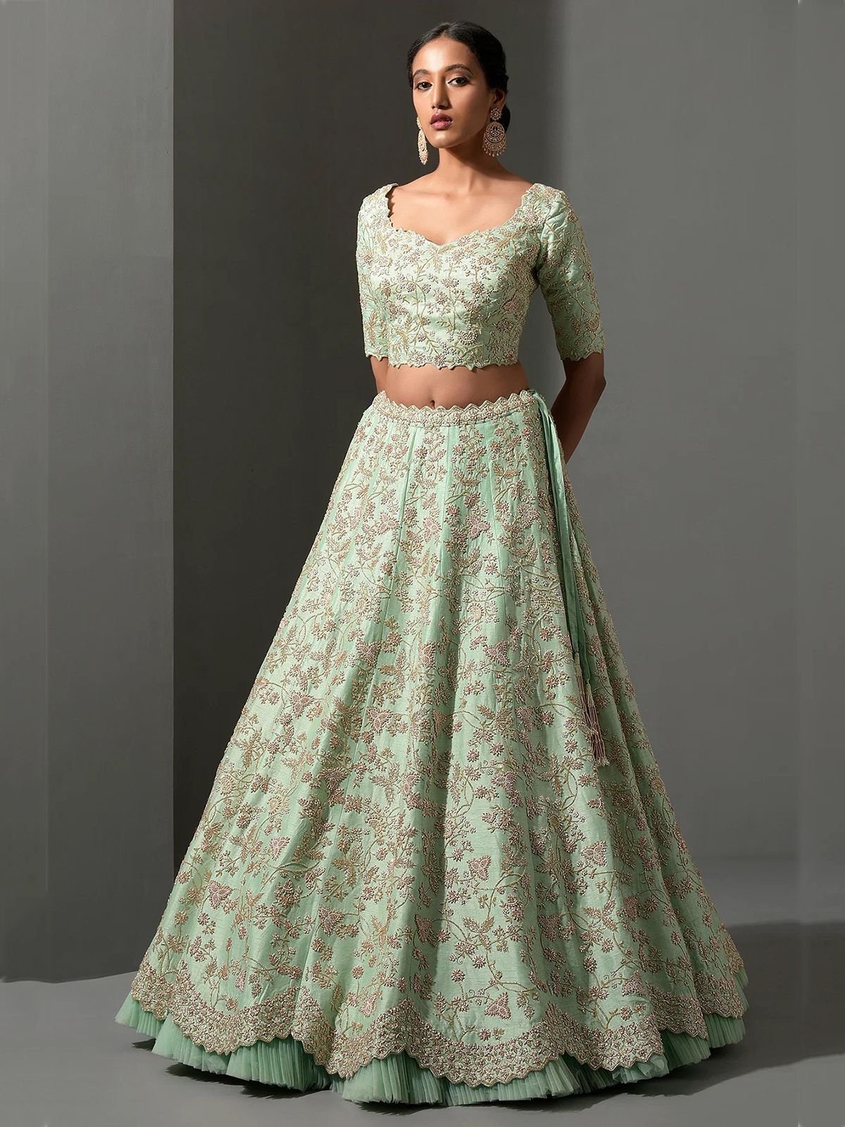 - Our charming pista green thread work silk wedding wear lehenga choli is a must-have for every fashion-forward woman looking to make a statement at any event. With its high-quality fabric, intricate detailing, and flattering design, this set is sure to turn heads wherever you go.