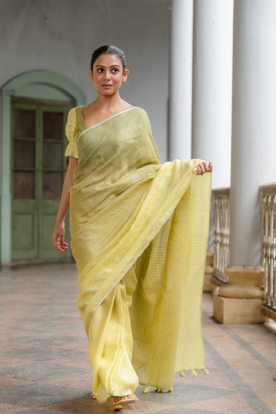 + Free ShippingFeel the citrus charm in this gorgeous olive ombre linen sari! This beautiful piece features a delicate, lemon-yellow gradient that is sure to brighten up your wardrobe. The linen fabric is soft and lightweight, making it a comfortable summer staple!