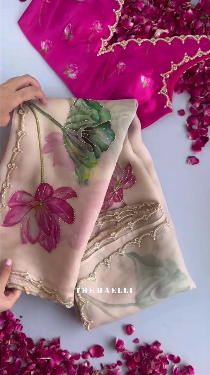 Handpainted Organza Saree with Intricate Lotus Motifs and Scallop Embroidered Borders Paired with a Vibrant Magenta Floral Blouse – A Perfect Blend of Tradition and Artistic Charm