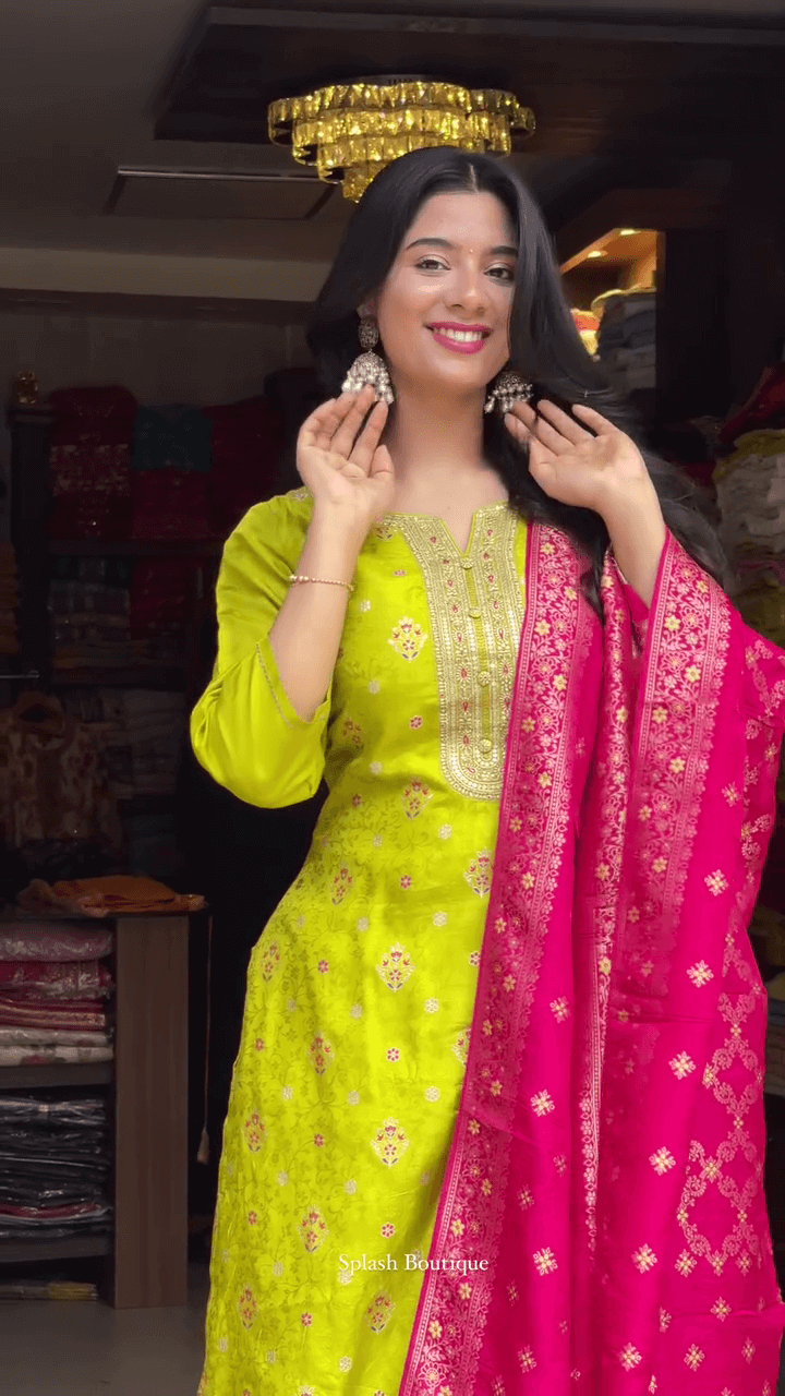 Lime Green Embroidered Straight Kurta Set with Intricate Golden Detailing and Contrasting Rich Pink Banarasi Dupatta – Ideal for Festive and Traditional Occasions