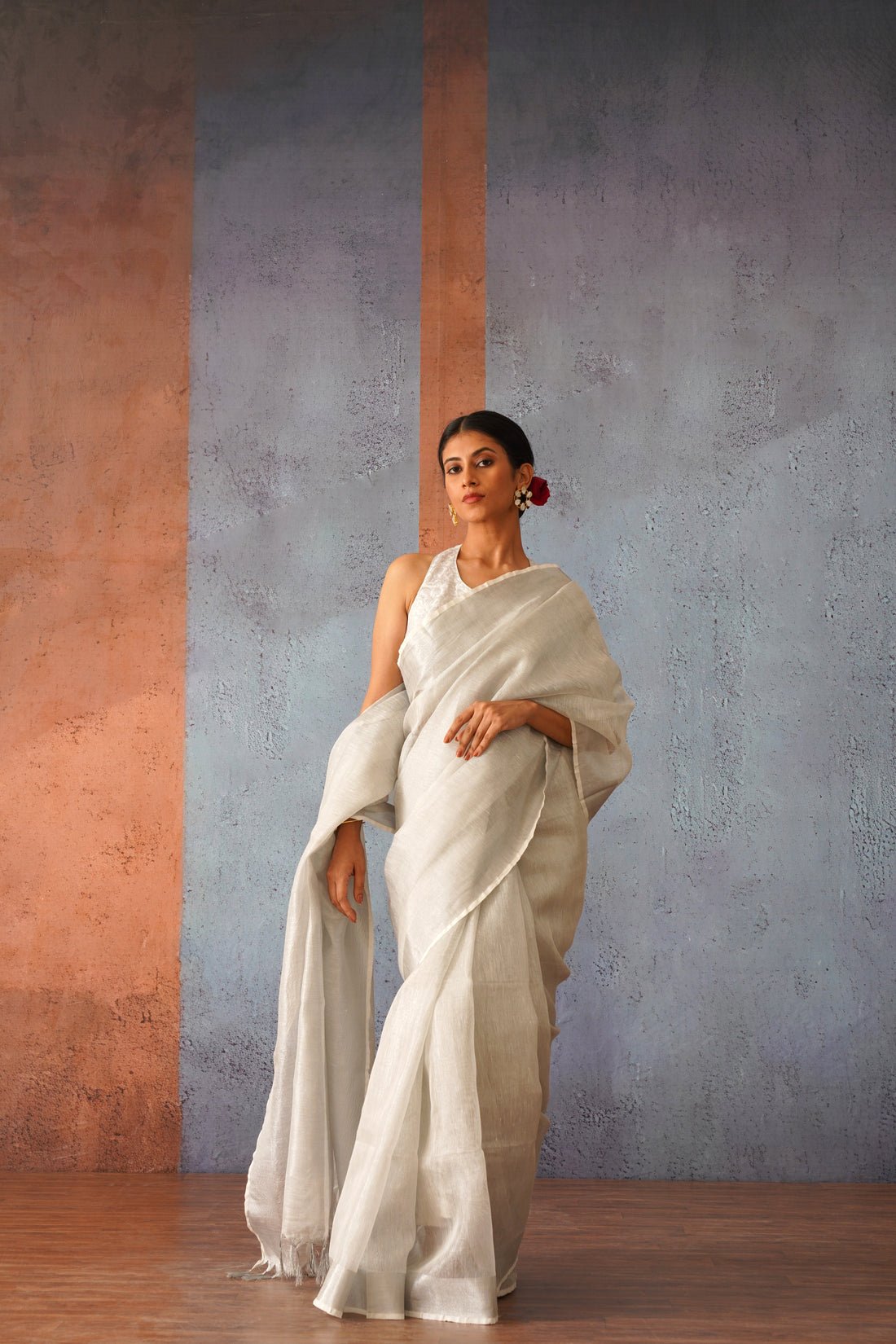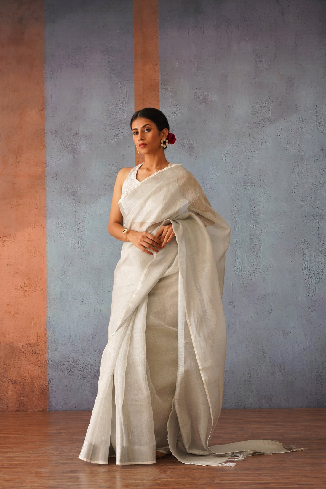Look radiant in this striking Moon Goddess Silver Linen Zari Sari. Featuring a luxurious silver linen and intricate zari detailing, this timeless piece offers stunning sheen and sparkle that will set you apart. Perfect for any special occasion, flaunt your style and shine like the goddess you are.