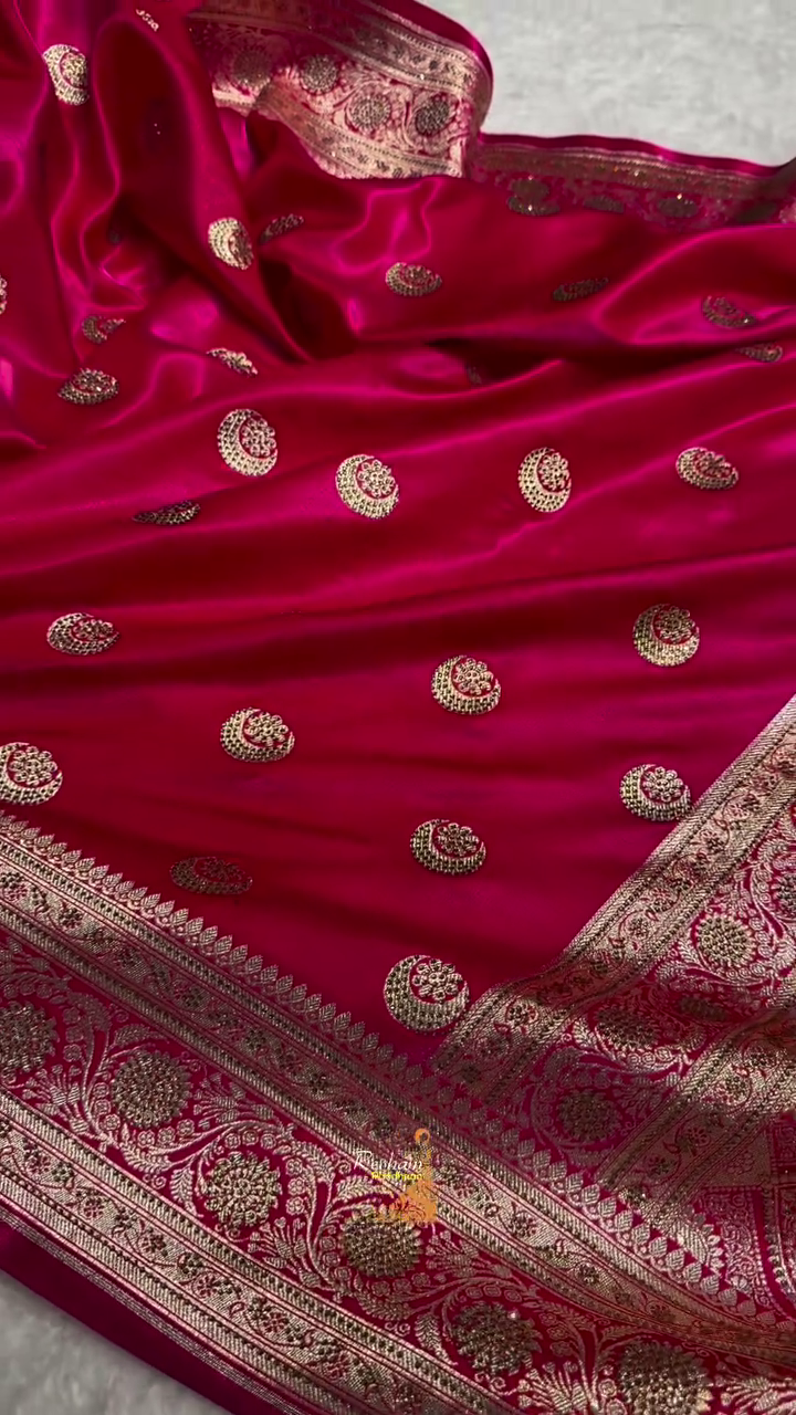 Features a wide, richly detailed border in gold zari with classic Banarasi floral patterns that exude heritage and sophistication. -