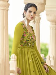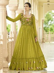 Buy outstanding green georgette wedding gown online at best price from Inddus. This stunning gown suit is the perfect wear for upcoming diwali festival celebration.