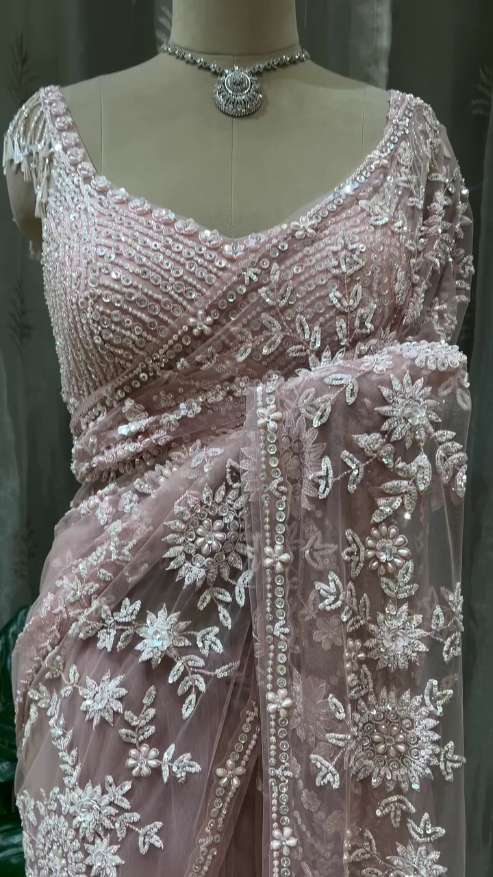Graceful Baby Pink Net Saree with All Over Intricate White Thread and Sequin Embroidery, Paired with Heavy Embellished Matching Blouse Featuring Tassel Sleeves – Perfect for Weddings, Receptions, and Special Occasions