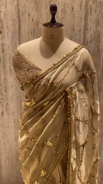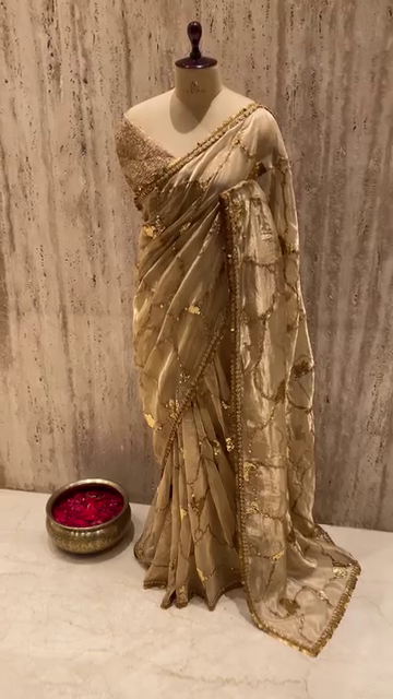 Luxurious Golden Designer Organza Saree with Intricate Sequin and Thread Embroidery, Handcrafted Detailing, and Embellished Border – Perfect for Weddings, Festive Celebrations, and Grand Occasions