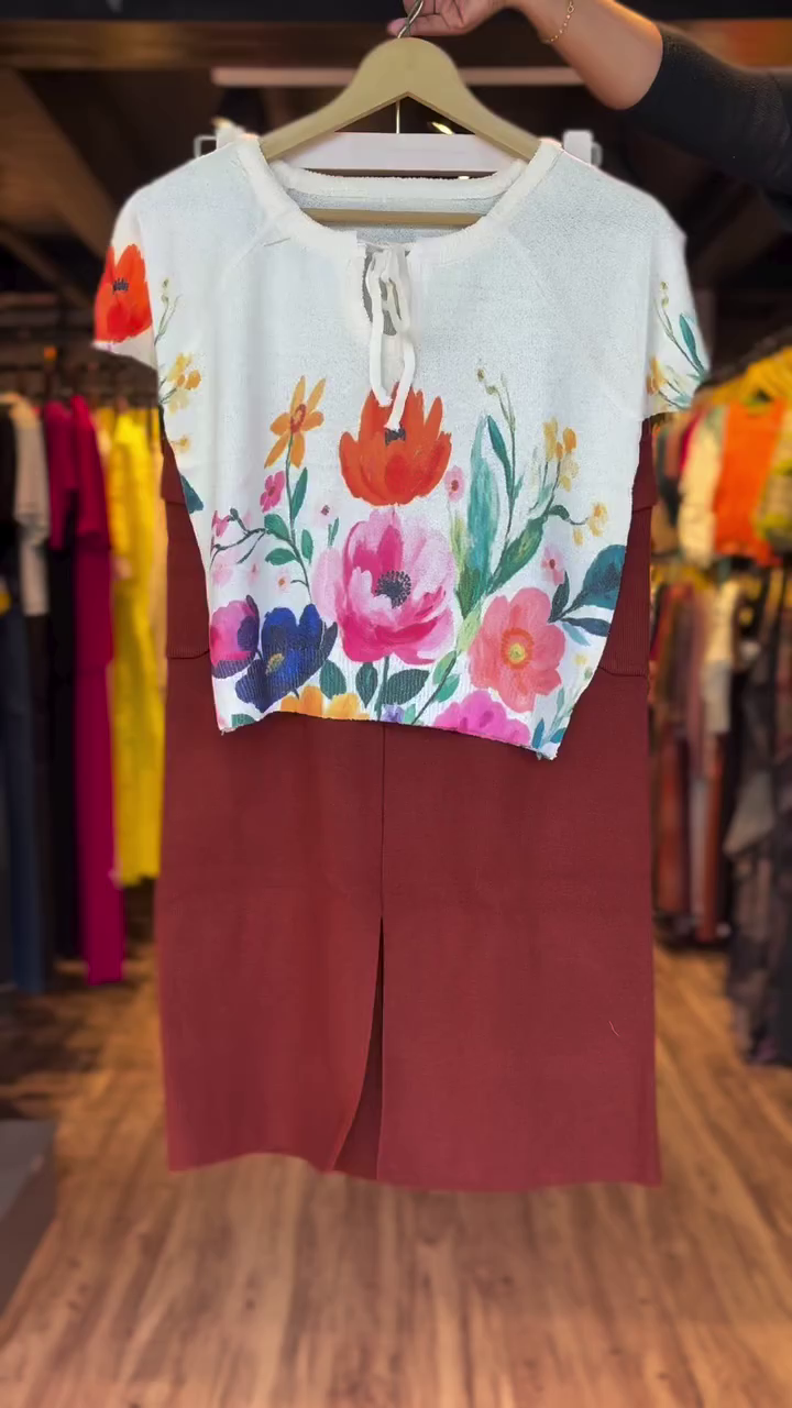 Chic Two-Piece Casual Wear Set with White Short Sleeve Floral Printed Top Featuring Front Tie Detail Paired with High-Waisted Rust Brown Knee-Length Skirt with Front Slit and Back Patch Pockets