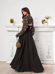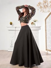 Complete your look with this elegant Thread Embroidered V-Neck Top With Skirt Co-Ords. The black embroidered top features a flattering V-neck and full sleeves, while the mid-rise skirt has a stylish flared hem and convenient zip closure. Made with a combination of lightweight polyester and luxurious silk blend fabric, these co-ords are perfect for any occasion. Dry clean for long-lasting wear.