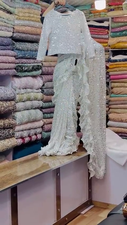 white Georgette Saree with all over seqwance work (4.50 mtr saree work) Satin banglori with seqwance work( both side work front and back )
